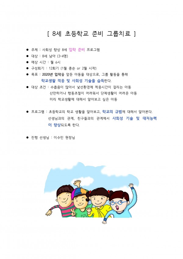 8세 입학준비 짝치료 및 그룹프로그램 아동 모집 페이지 정보 작성자 관리자 작성일20-01-08 17:50 조회1,852회 댓글0건 이전글 다음글 목록 본문 댓글목록 등록된 댓글이 없습니다. 이전글 다음글 목록