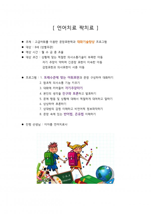 8세 입학준비 짝치료 및 그룹프로그램 아동 모집 페이지 정보 작성자 관리자 작성일20-01-08 17:50 조회1,853회 댓글0건 이전글 다음글 목록 본문 댓글목록 등록된 댓글이 없습니다. 이전글 다음글 목록